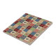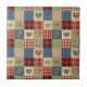Warm rustic patchwork pattern ceramic tile featuring stitched heart motifs, plaid checks, and country-style fabric blocks in red, blue, green, and beige tones. A cosy farmhouse-inspired design ideal for country decor lovers, quilting fans, and rustic home enthusiasts. Perfect as a heartfelt gift for couples, moms, or cottage-style fans