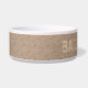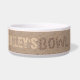 Personalised dog bowl with paw print lettering in shades of brown with textured effect background for a rustic look.