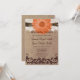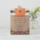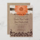 The background is a distressed vintage paper print with a slightly textured look. It has an ornate floral vine scroll print at the bottom of the invitation. The top of the invitation features a bright orange daisy flower on top of printed lace and printed twine ribbon design. It has the look of a layered invitation held together by twine, however it is just a flat printed invitation to save you money. These rustic daisy wedding rehearsal dinner invitations are perfect for country weddings, barn weddings, farm weddings, cowboy weddings, rustic weddings, and anyone who is using peach or coral coloured flowers in their wedding bouquet or wedding reception decor.