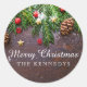 Rustic Personalised Christmas sticker seals with a festive Christmas tree branches,pine cones,golden stars and snow on a country wood background.Personalise with family name to make it special.