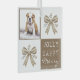 Send warm wishes with this charming rustic Christmas Glass Ornament. Featuring a customizable photo template, delicate bows with botanical accents, and the cheerful message "Jolly Happy Merry," this design offers a perfect blend of modern farmhouse style and festive cheer. Its warm brown and cream palette evokes a cozy holiday spirit, ideal for sharing your family's joy or your beloved pet's adorable moment.