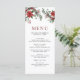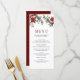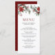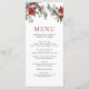 Elegant wedding menu featuring beautiful red poinsettia flowers with pine cones and leaves.