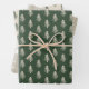 Custom-designed Christmas wrapping papers featuring rustic forest green and beige hand-drawn style pine trees and plaid design.