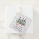 A warm rustic Christmas tree farm theme gift tag, with festive ornaments, string lights, and merry Christmas script typography overlay, on a whitewashed shiplap wood background with falling snow. For a soft earthy homey rustic vibe with modern typography.