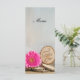 The charming Rustic Pink Daisy Woodland Wedding Menu with the details of the meal that you will serve at your natural woods or forest theme engagement party, bridal shower luncheon or marriage reception dinner by adding the salad or first course, entree or second course and dessert or third course. This informal yet elegant custom outdoor theme wedding menu features a digitally enhanced nature photograph of a pink gerber daisy flower blossom, wood slices with the word LOVE burned on it and white bridal veil with a white satin background.