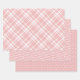 Rustic modern gift wrap set features three coordinating holiday wrapping paper sheets: light rose gold pink and white tartan plaid, black with white script "Merry Christmas" text, and pink with little white pine trees pattern.