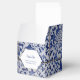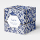 This design features rustic Portuguese tile patterns. The wedding text is elegantly framed with a white and gold colour geometric shape. Unique Azulejo blue and white floral wedding favour box design with modern elements. Matching wedding invitations and other stationery items are also available.