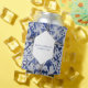This design features rustic Portuguese tile patterns. The wedding text is elegantly framed with a white and gold colour geometric shape. Unique Azulejo blue and white floral wedding can cooler favour design with modern elements. Matching wedding invitations and other stationery items are also available.