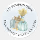 Country pumpkin address labels with rustic fall illustration in watercolor with log basket, jug of wheat and a pink pumpkin. The template is set up for you to add your address.