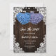 Romantic rustic purple and blue floral wedding save the date card featuring hydrangea flowers against a barn wood background adorned with white floral lace and string lights.