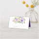 Rich purple floral design is perfect for a spring or summer wedding. In addition to the deep purple flowers, there are smaller light pink and soft ivory white flowers. There are a variety of leaves that give the floral design a light and airy quality. The wedding couple names are written in a gorgeous formal script in purple and surrounded by a lush floral wreath. The remainder of the text is an elegant black font. The front of the wedding place card has the a line for the guest's name and a space for the table number. The back of the place card is where the wedding couple's names are written.