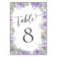 Add a touch of elegance to your reception with this boho-chic table number card, showcasing a beautiful arrangement of purple watercolor florals on a crisp white background. The soft botanical design brings natural charm to your tables, seamlessly enhancing a bohemian or garden-inspired wedding theme. Both stylish and practical, this card not only directs guests to their seats but also adds a subtle decorative flourish to your overall tablescape. Perfect for creating a cohesive and visually stunning setting on your special day.