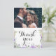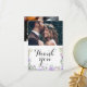 This rustic wedding thank you card showcases original watercolor artwork of delicate purple florals and sage green eucalyptus, bringing a natural elegance to your heartfelt message. With graceful calligraphy and space for two of your favourite wedding photos, this card beautifully captures the spirit of your special day. Perfect for adding a personal and memorable touch, it allows you to express your gratitude in a way that friends and family will cherish.