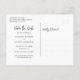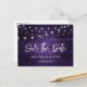 Rustic purple wedding save the date postcard featuring rustic wood adorned with string lights.