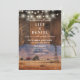 This rustic western barn wood wedding invitation featuring a western ranch mountains scene and string lights on a barn wood background can be personalized with your information in stylish typography. Designed by Thisisnotme©