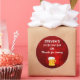 Thank you sticker for a birthday party. The background is a deep red grunge style painted texture background with thick brushstrokes, scrapes and scratches. A bright candy coloured red layered over a dark ruby red colour. An illustration of a frothy beer mug is placed underneath the text.