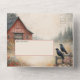 This all-in-one wedding invitation features a beautifully illustrated rustic farmstead with a classic red barn surrounded by soft, misty trees, winding paths, and wildflowers in warm, autumn-inspired hues, creating a peaceful countryside setting. Black crows perched on weathered wooden fences and scattered in the sky add depth and character, lending a slightly moody, storybook charm without overwhelming the design. The tall, vertical layout flows naturally from a rich barn-red top flap into the main invitation artwork, followed by a clearly structured RSVP section and a coordinating barn illustration at the bottom, tying the entire piece together. The muted color palette of barn red, warm neutrals, soft greens, and earthy florals gives the invitation a timeless, romantic feel that is especially well suited for rustic, country, farm, or barn-style weddings.