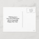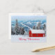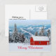 A photo of a red barn with its roof covered in snow. The background is a beautiful scene of pine trees and mountains. The text on the front says "Merry Christmas" and the back says "Wishing you a very merry Christmas and an especially Happy new Year." Personalise these postcards cards with your own message if you wish.