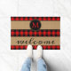 Fun doormat with contemporary black and red chequered plaid pattern on burlap background. Stylish rustic unique design with room to customise or personalise with your family name monogram. Original personalised monogrammed outdoor decor accent for decorating the front porch or yard of your country cottage house, log cabin, mountain lodge, fishing camp, lake or river vacation home.
