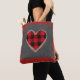 This tote bag features a grey burlap background with red burlap edging and in the centre a red and black buffalo plaid heart with faux vintage lace edging it. Designed by world renowned artist ©Tim Coffey.