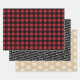 Rustic modern gift wrap set features three coordinating holiday wrapping paper sheets: red and black buffalo plaid, black with white script "Merry Christmas" text, and kraft tan brown with white winter snowflakes pattern.