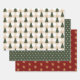 A collection of coordinated holiday wrapping papers. One features a beige gingham background with a green Christmas tree pattern, the second is a burnt red background with a gold snowflake and the third is a coordinating green with a beige polka dot.