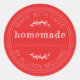 Rustic Red Homemade Baked Goods Round Sticker featuring a bold red background with vintage-inspired typography and stitched detailing. Perfect for labelling homemade jams, baked goods, preserves, and handcrafted food gifts. A warm, classic design that highlights small-batch, made-with-love products.