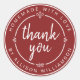 The Rustic Red Homemade Thank You sticker features a warm deep red background, soft white lettering, and a textured handwritten script that adds a heartfelt handmade touch. This classic round sticker is perfect for small business packaging, homemade treats, craft fair products, and thoughtful gifting. Its cozy rustic look helps every wrapped item feel personal, warm, and made with love.