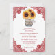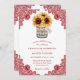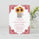 Rustic red and sunflower wedding invitation featuring a sunflower and baby's breath bouquet inside a mason jar against a plain white background adorned with red floral lace. Perfect card design for inviting your guests to your red rustic country wedding party inspired by sunflowers.