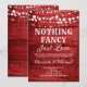 Celebrate love without the fuss with this charming and heartfelt rustic wedding invitation. Bold "Nothing Fancy, Just Love" typography paired with a rich red wood plank background and glowing white string lights perfectly captures the spirit of a laid-back, intimate ceremony and dinner.