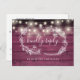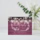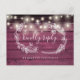 A rustic RSVP card featuring pretty string lights, hand drawn floral garland and chic typography on a burgundy red wood panels background. The reverse features your details and a fun guest song request. Designed by Thisisnotme©