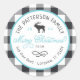 Affordable custom printed round return address stickers personalised with your family name, the year and your return address. This fun design features a buffalo check plaid background, reindeer graphic and modern rustic typography in aqua, white and charcoal grey colours. The text reads "Merry Christmas" in a trendy script font. Use the design tools to edit text fonts and colours to further customise your own unique holiday return address labels.