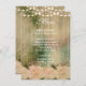 An Elegant rustic wedding dinner menu card with wood background, soft pink roses, and a string of lights. This wedding dinner menu card is part of a complete set,