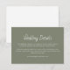 Modern Wedding Details enclosure card on a rustic sage green background. With customisable lettering, you can add your names, details and website. Great for adding a casual and simple touch to your wedding stationary suite.
