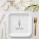Modern casual wedding reception paper plate, with a sage green pine tree and customisable typography design. A rustic addition to your wedding reception party supplies.