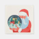 Rustic style Santa holding a globe with a town, frozen lake, and skaters.
