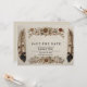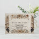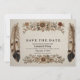 This elegant image is a vintage-style card with the phrase "SAVE THE DATE" in a simple serif font. The text is framed by detailed, hand-drawn illustrations of flowers, leaves, and large feathers in earthy tones. The overall rustic and bohemian design is perfect for a wedding or special event invitation. Fill it in with your details for your special day.