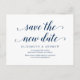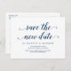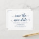 This is the modern minimal clean rustic design themed, in Navy Blue font, Wedding party invitation Rescheduled (postponed / postponement) postcard (Save the new date) . It is the perfect and elegant way to make the reschedule announcement to your friends and family.