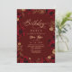 Modern stylish flowers birthday party invitation burgundy with gold roses, dust on with a gold ink pour effect (the gold is a digital effect, not real foil) and modern calligraphy. Classy and elegant, simple and modern invitation.