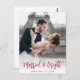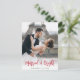 red rustic lettering wedding announcement holiday card, couples image can be personalised.