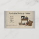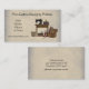 Prim rustic business card for sewing and quilting artisans with cutely detailed graphics of a vintage sewing machine, stacks of fabric, a doll and a steam trunk. Customize all text in the simple online Zazzle form.