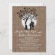 Country rustic look of burlap with a couple under a tree in the moon light engagement party invitation.