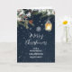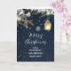Merry Christmas for grandson his family card with rustic winter greenery, vintage lantern and snowflakes pattern on a navy blue sky.