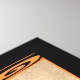This wrapped canvas offers moody light shining on a motionless segment of simple globe and pitcher shaped terracotta wind chimes that are set in a spiralled effect. This photo is framed by a thin orange line with a tribal-like digital art design along the top and bottom and a black border.  The image was altered with photo editing software for a distressed effect. Be sure to check under Framing Options/b> where you can select from two other canvas thicknesses,  a number of panel options and sepia or black and white effects.