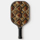 Warm geometric stripe pattern pickleball paddle featuring tribal-inspired diamonds, zigzags, and textured vertical bands in earthy brown, terracotta, tan, beige, and charcoal tones. A cozy boho design ideal for southwestern décor lovers, rustic style fans, and anyone drawn to earthy, handcrafted aesthetics.
