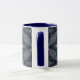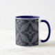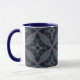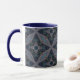 With the rich tones of aged wood, stone, and weathered rooftops, this mug features a kaleidoscopic starburst pattern made from architectural textures. Muted browns, deep greens, slate greys, and sky blues form a rustic yet structured mandala that feels both handcrafted and geometric. The deep navy interior and handle create a calming contrast, perfect for quiet mornings, cosy cabins, or those who love natural textures and symmetry.