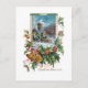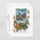Quaint rustic stone church covered in snow in gold frame embellished with holly & brass bells with Christmas Greetings message. Back features unique custom complementary graphics with editable text fields.