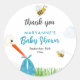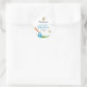 Delightfully charming customisable sticker for a boy baby shower featuring a cute stork with bees and butterfly on a meadow. A soft pastel background, and at its centre a whimsical stork, gracefully illustrated, carries a sweet bundle wrapped in a soft cloth. Surrounding the stork, a few playful bees with friendly smiles and a butterfly fly about, adding a lively touch to the scene. Soft fluffy clouds adorn the sky. Celebrate the impending arrival of the new baby with this cute stork themed baby shower. This illustration conveys a sense of joy, warmth, and festive anticipation of the newest family member. Personalise the item with your info.