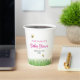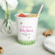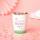 Delightfully charming customisable paper cup for a girl baby shower featuring a cute stork with bees and butterfly on a meadow. A soft pastel background, and at its centre a whimsical stork, gracefully illustrated, carries a sweet bundle wrapped in a soft cloth. Surrounding the stork, a few playful bees with friendly smiles and a butterfly fly about, adding a lively touch to the scene. Soft fluffy clouds adorn the sky. Celebrate the impending arrival of the new baby with this cute stork themed baby shower. This illustration conveys a sense of joy, warmth, and festive anticipation of the newest family member. Personalise the item with your info.