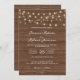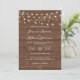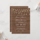 Printed dark wood wedding invitation design that features strings of light across the top and the words happily ever after in unique script circled by simple laurel leaves on the reverse side of the card. Fully customisable.